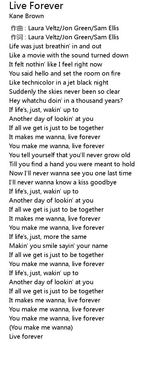 "Kane Brown - Live Forever (Lyrics)", Live Forever by Kane Brown Album: Experiment Spotify: https://open.spotify.com/track/0dWw0ypS3y3705RdwvpCha Live Forever . "Tatiana Manaois - Live Forever (Lyrics Video)", ..